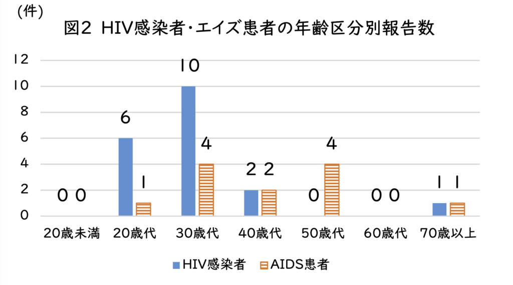 また、HIV感染者・エイズ患者の年齢区分別報告数は以下のグラフのようになっています。