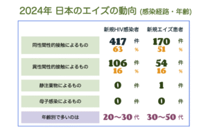 2024年1月1日〜12月31日の1年間で、日本国内において報告された「新規HIV感染者」「新規エイズ患者」の感染経路と年齢層の動向については以下の通りとなります。